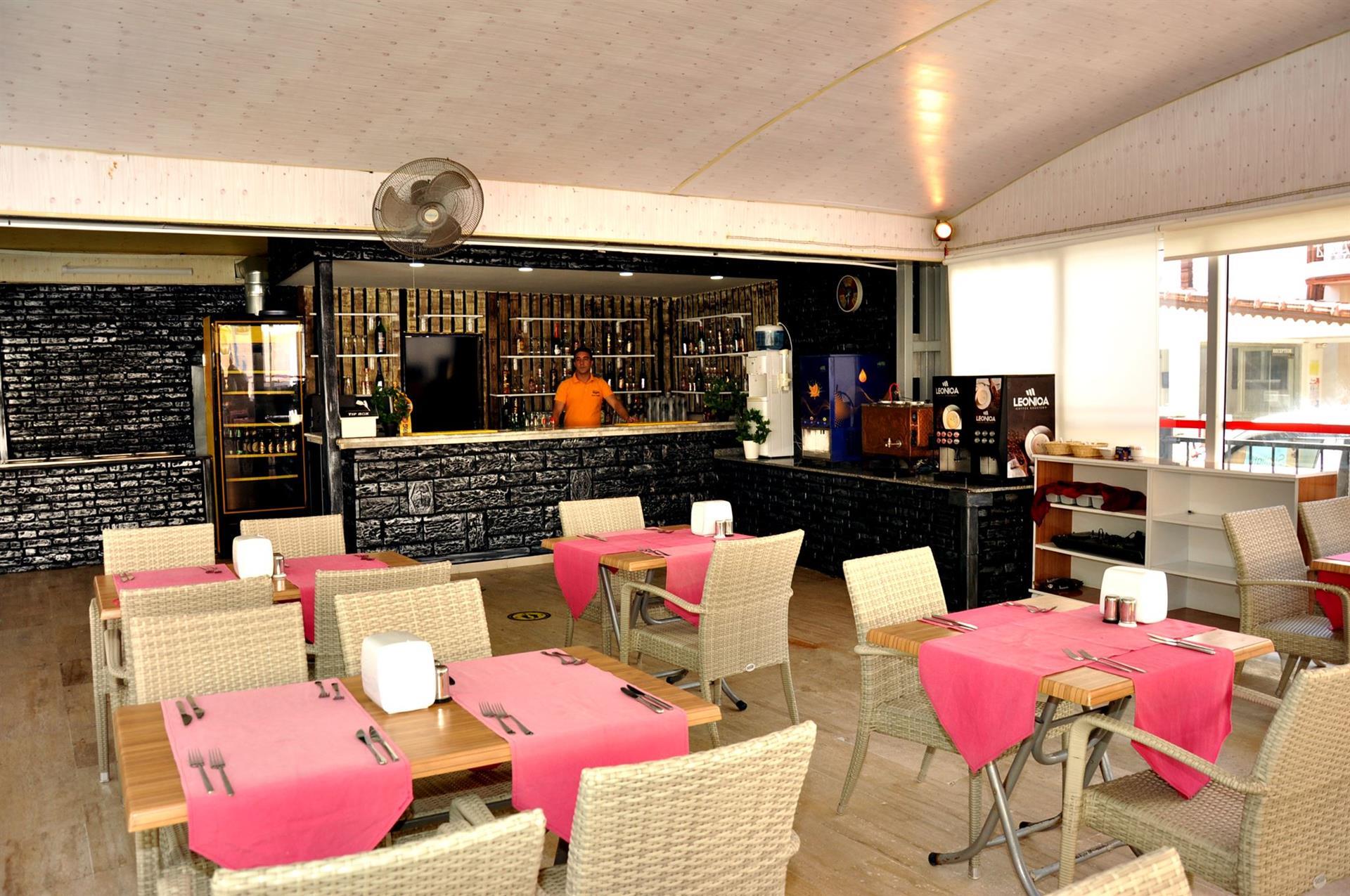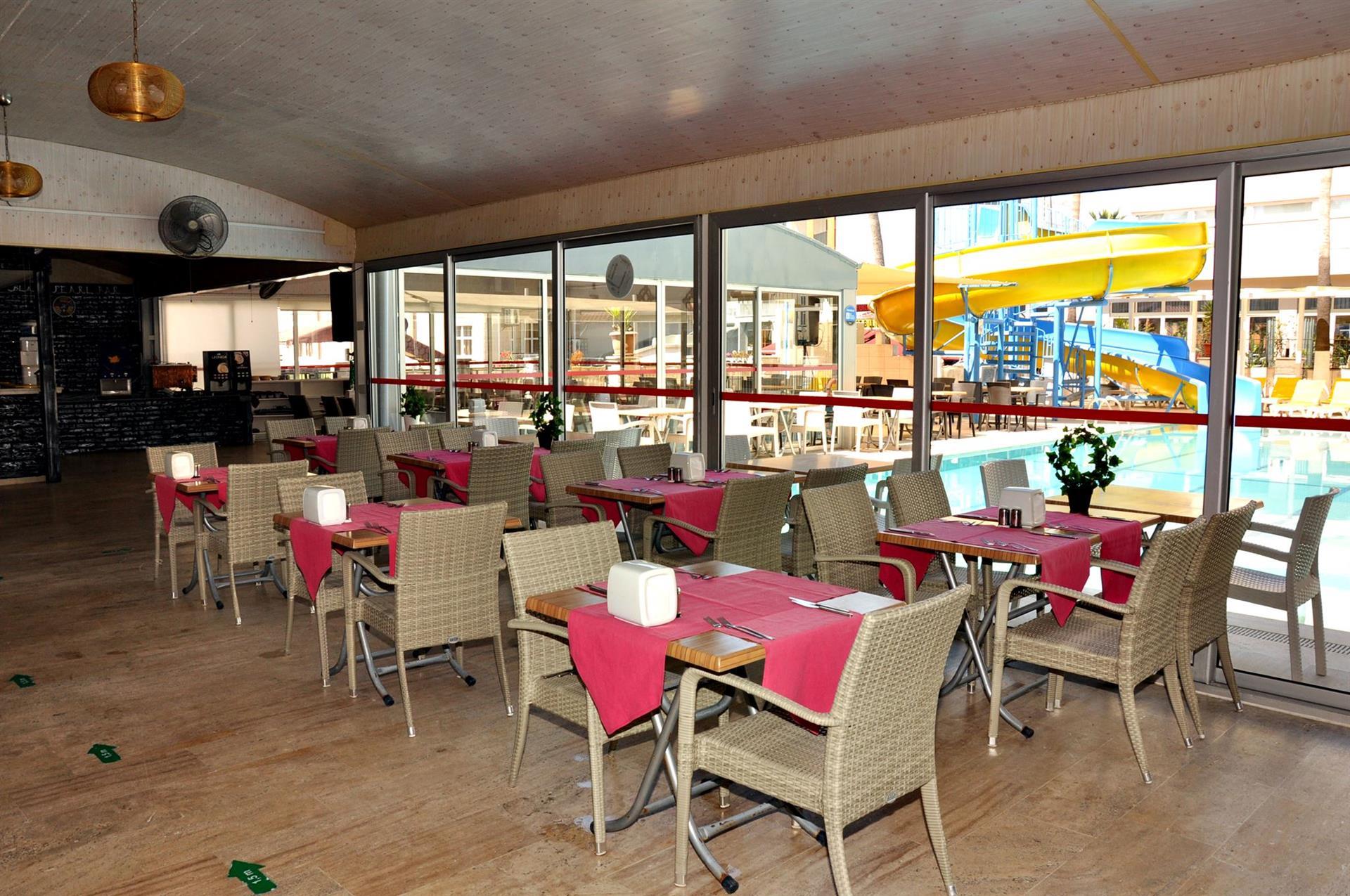 Главный ресторан отеля предлагает питание по системе «все включено». На завтрак здесь подают блинчики с пылу с жару, свежие булочки, джемы, сыры и сухие завтраки. В обед предлагаются супы-пюре, мясные и овощные блюда, а также бессчетное количество салатов. Ужин – это настоящий праздник живота с большим выбором горячих блюд, фруктов и десертов. В течение дня в баре у бассейна разливаются алкогольные и безалкогольные напитки местного производства.